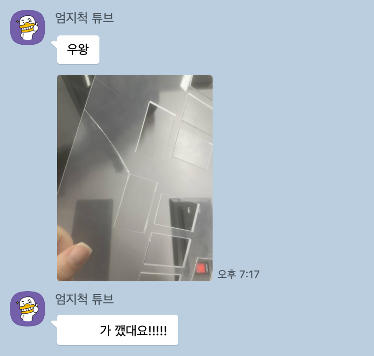 이 작업에서는 학교 메이커스페이스 운영 사업단의 지원을 받아, 5T 아크릴 판과 레이저 커팅을 지원받았다. 사업단에서는 일반적으로 5T 아크릴 판을 개당 25,000원에 재료비를 받아 제공한다고 한다.
