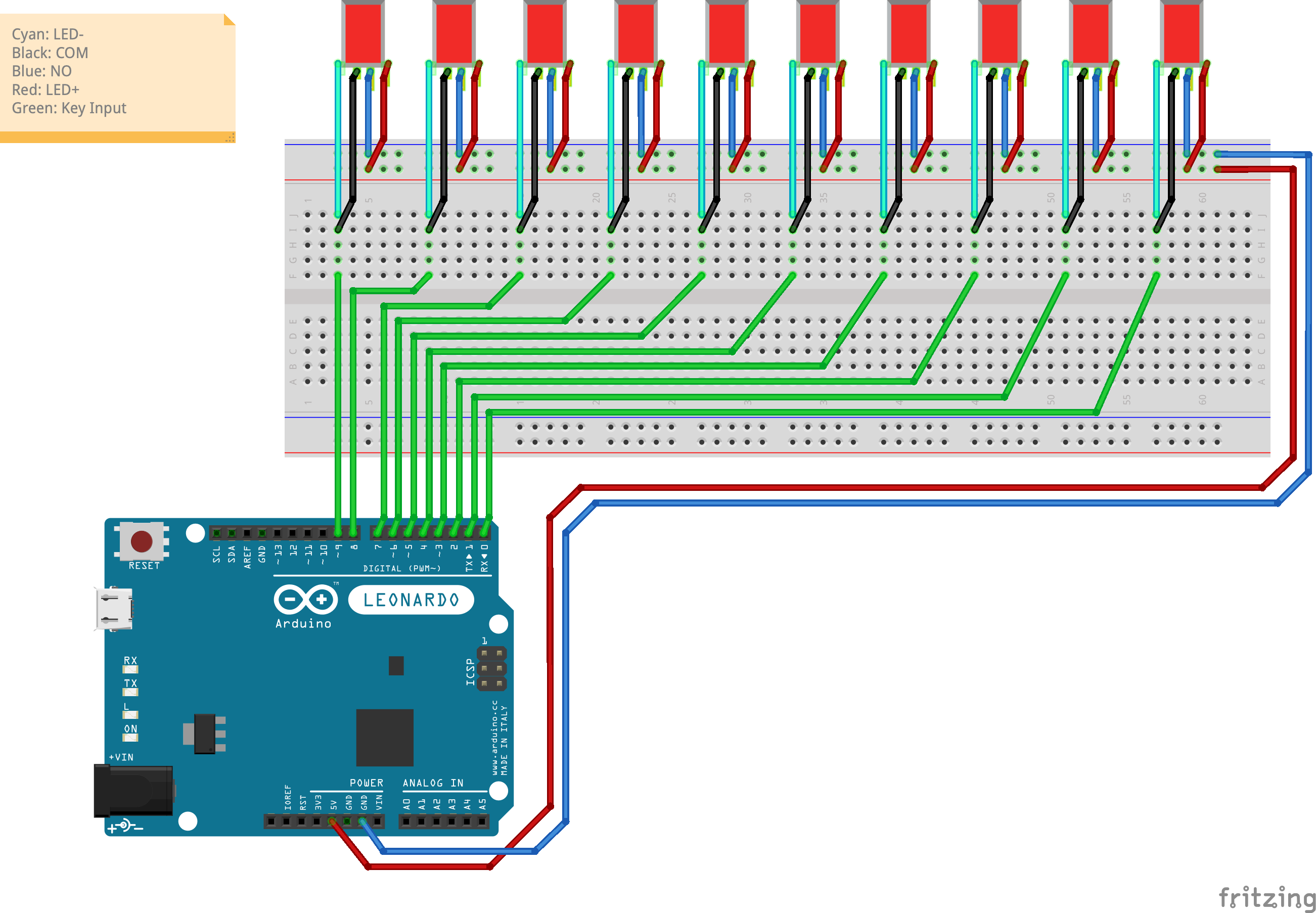 아케이드 버튼 컨트롤러에서는 각 스위치와 아두이노 핀을 1:1로 연결했다. 스위치와 LED의 각 한쪽 전극을 각각 VIN, GND에 연결하고, 다른 쪽의 전극 두 개와 아두이노 핀을 연결하였다.