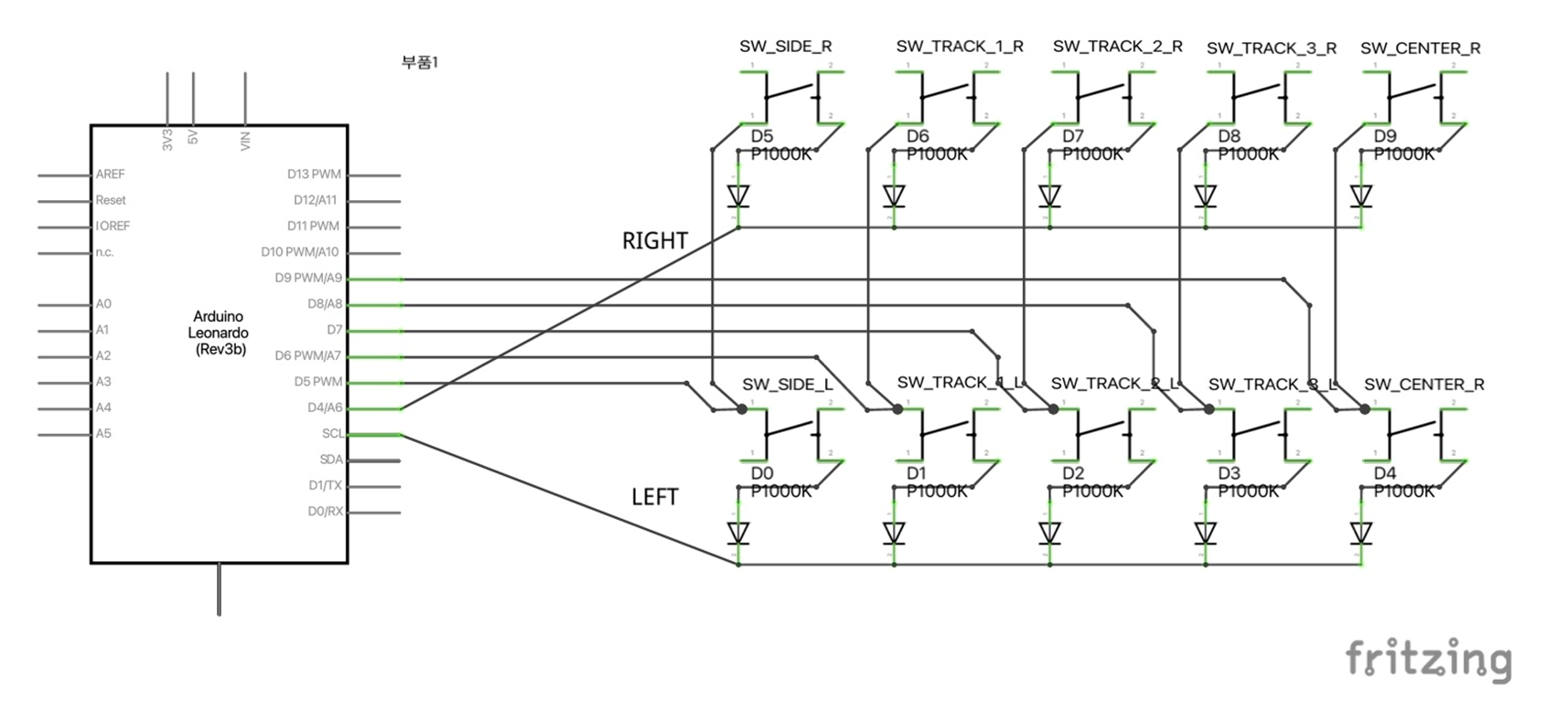 초기화 과정을 거치면서 행 핀(PIN_TRACK_L, PIN_TRACK_R)은 HIGH 전압을 출력하고 있고, 입력 핀인 열 핀들(PIN_TRACK_SIDE, PIN_TRACK_1, …)은 풀업 입력 모드로 HIGH 전압 상태를 유지하고 있다.
