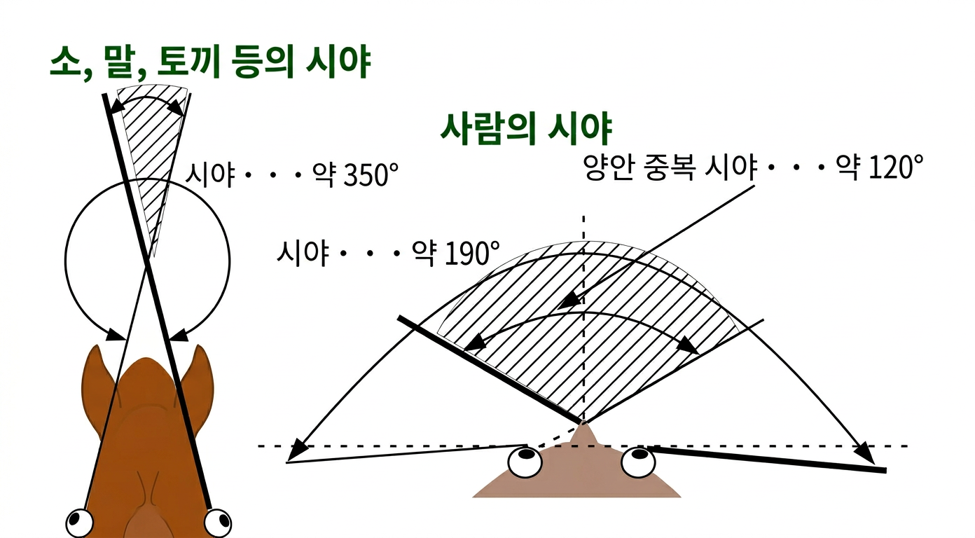 인간을 포함해 동물의 시야 범위는 종에 따라 크게 다르다. 예를 들어, 소, 말, 토끼 등의 초식동물은 포식자를 넓은 범위에서 감시하기 위해 눈이 머리 양옆에 위치하여 매우 넓은 시야를 가질 수 있다.