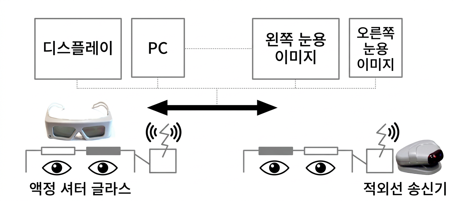 액정 셔터 글래스(LCD Shutter Glasses)는 디스플레이가 좌안용과 우안용 화상을 번갈아 표시하는 것에 동기화하여, 안경의 좌우 액정 셔터를 교대로 차폐하는 방식이다. 풀컬러 입체 화상이 가능하지만 고속 동기화와 고주사율 디스플레이가 필요하다.