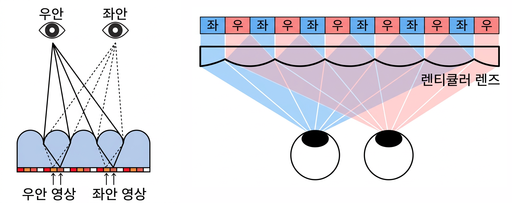 렌티큘라 렌즈(Lenticular Lens) 방식은 패럴랙스 배리어 방식의 슬릿에 의한 화면 어둠 문제를 해결하는 방법이다. 차폐 슬릿 대신 단면이 반원형인 원통형 볼록렌즈를 나란히 배열한 시트를 배치하여, 빛을 차단하는 대신 굴절시켜 각 눈의 방향으로 해당 화상의 빛을 유도한다. 빛이 차단되지 않고 굴절되어 분배되므로, 패럴랙스 배리어 방식에 비해 화면이 밝게 유지된다.