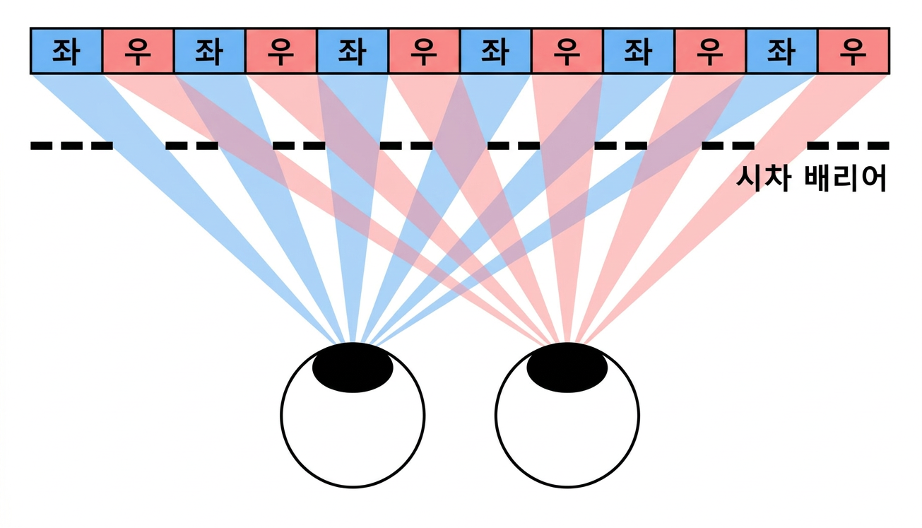 패럴랙스 배리어(Parallax Barrier) 방식은 통상 액정 화면의 전면에 유광 차폐 슬릿을 배치하고, 우안용과 좌안용 화상을 가는 띠 모양으로 분리하여 좌, 우, 좌, 우 순으로 배열하는 방식이다. 슬릿이 각 눈에 해당하는 화상만 도달하도록 빛을 차단하여 입체감을 만들어낸다.