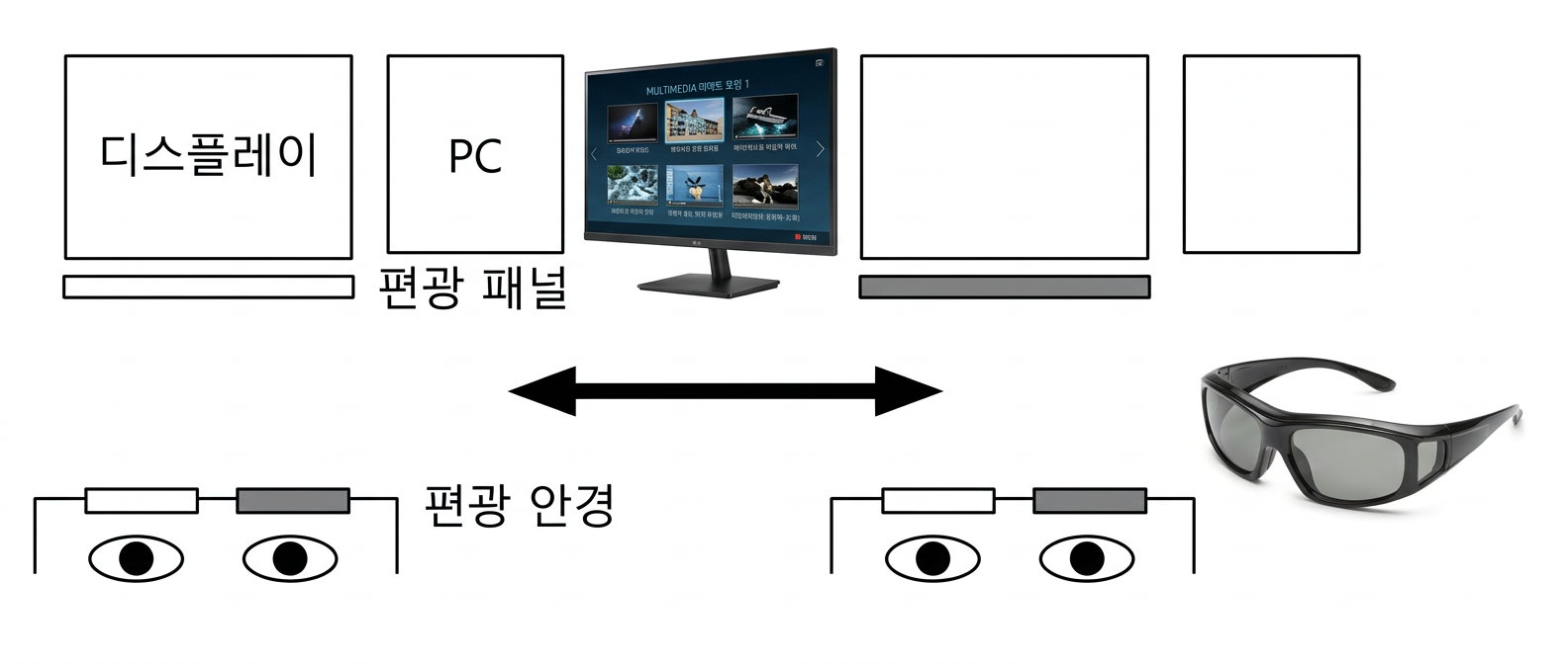 편광 글래스는 좌안용과 우안용 화상을 서로 다른 편광 상태로 인코딩하여, 편광 필터가 달린 안경으로 분리하는 방식이다. 풀컬러 입체 화상이 가능하고, 디스플레이의 밝기를 유지할 수 있지만, 편광 필터가 필요한 디스플레이와 안경이 필요하다.