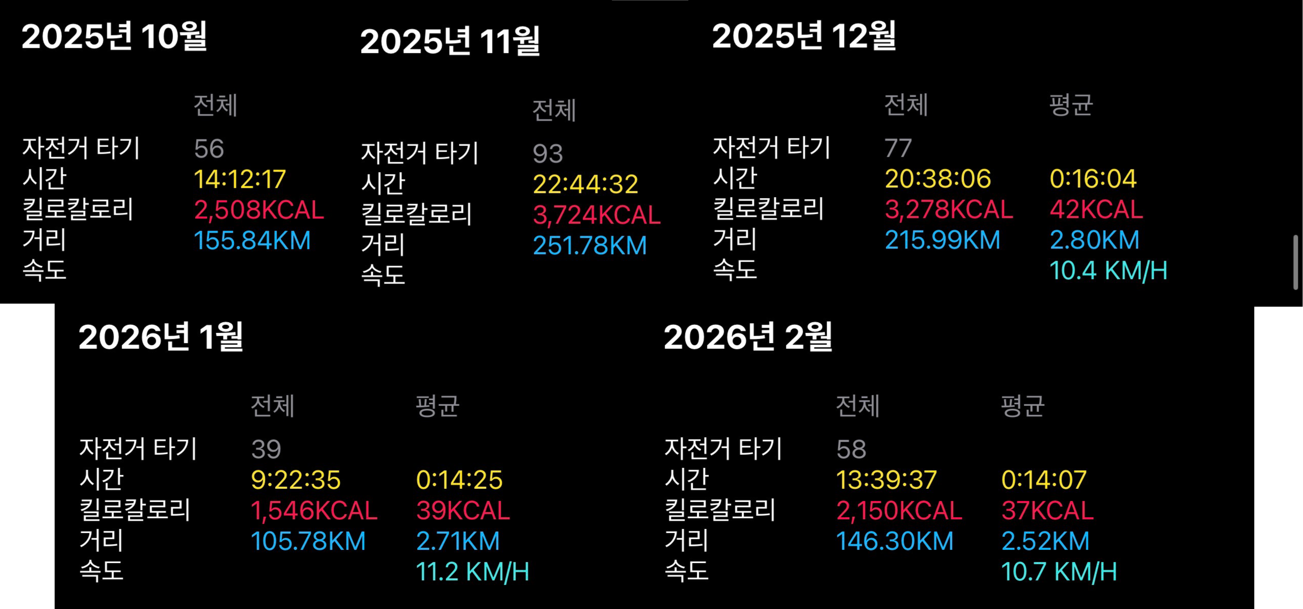 대개는 애플워치의 운동 자동 인식 기능이 기록한 내용이니까, 실제로는 월에 250km는 타지 않았을까 싶습니다. 아무렴 그렇게 타면 있던 살이 문제가 아니라, 우선 하체 운동은 하지 않아도 될지도 모르겠습니다.
