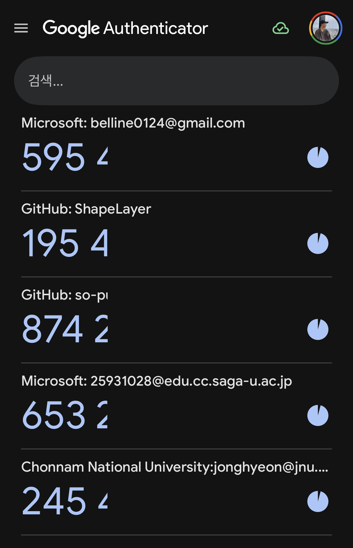 Google Authenticator에 다양한 회사의 계정 로그인 정보를 저장한 모습. 이와 같이 한 번에 관리하는 것도 가능합니다.
