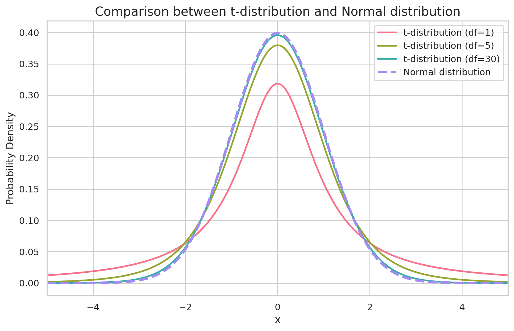 \[\begin{aligned} T &= \frac{X}{\sqrt{Y/k}} \\ &= \frac{Z}{\sqrt{U/v}} \sim t_v \end{aligned}\]모집단이 $N(0, 1)$ 을 따르므로, $E(T)=0 (v>1)$ 표준정규분포와 평균은 같으나, $Var(T)=\frac{v}{v-2} (v>2)$ 로, 분산은 t-분포가 항상 더 크다.(표본의 크기가 $\inf$ 로 발산한다면 이미 모집단이라고 가정할 수 있을 것이므로, 표준정규분포의 분산과 같아질지도 모르겠으나, 그건 이미 표본이 아니다.)