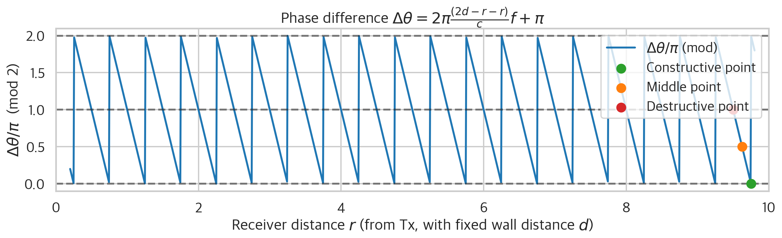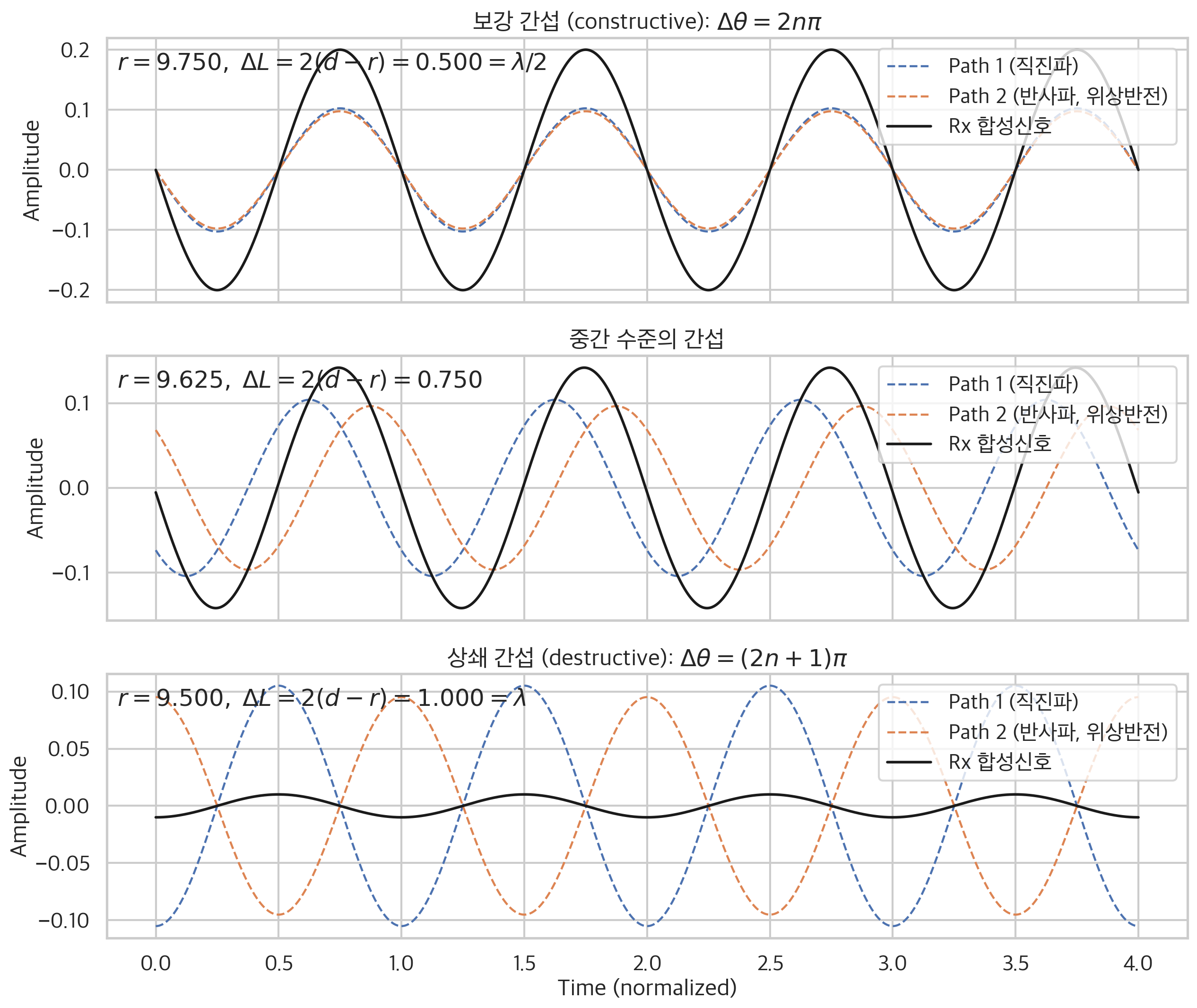 만약 이 $\Delta \theta$ 가 짝수배라면 $\text{Sig}\text{Rx}$ 는 두 신호가 서로 보강하는 형태가 되어, 수신되는 신호의 세기가 커진다. 반대로 $\Delta \theta$ 가 홀수배라면 $\text{Sig}\text{Rx}$ 는 두 신호가 서로 상쇄하는 형태가 되어, 수신되는 신호의 세기가 작아진다.