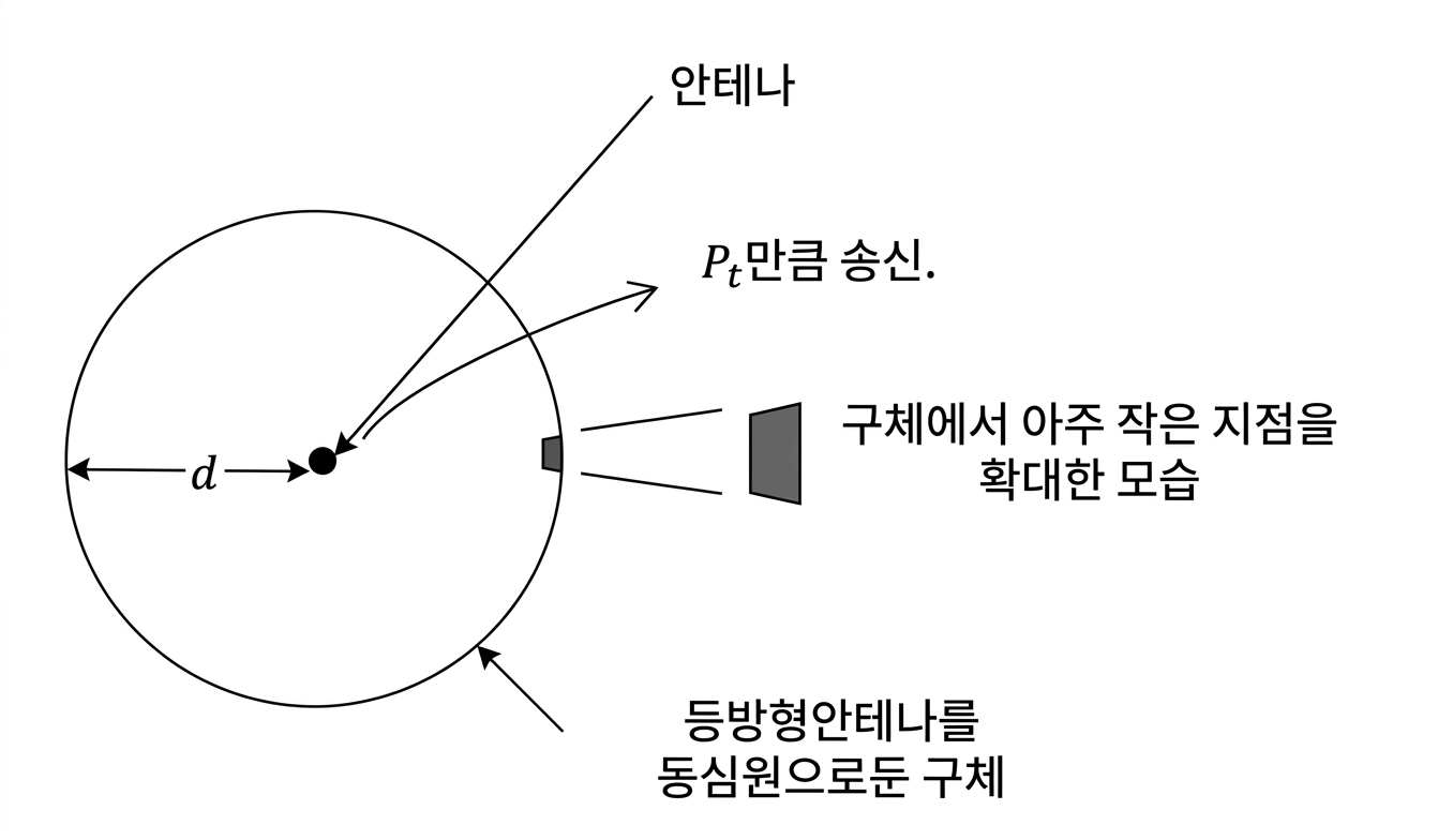 등방형 안테나의 전파 범위는 구면으로 간주되어 송신전력 $P_t$ (W)와 안테나로부터의 거리 $d$ (m)에 대해서 다음과 같이 표현된다.