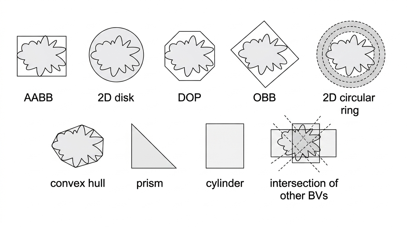 Bounding Volume Hierarchy (BVH)는 모든 물체들의 관계를 계층화하여, 충돌이 발생할 타당할 우려가 있는 물체 쌍을 같은 계층에 배치, 각 계층에 대해 충돌 검사를 수행하는 방식으로 충돌 검사의 계산량을 줄였다.