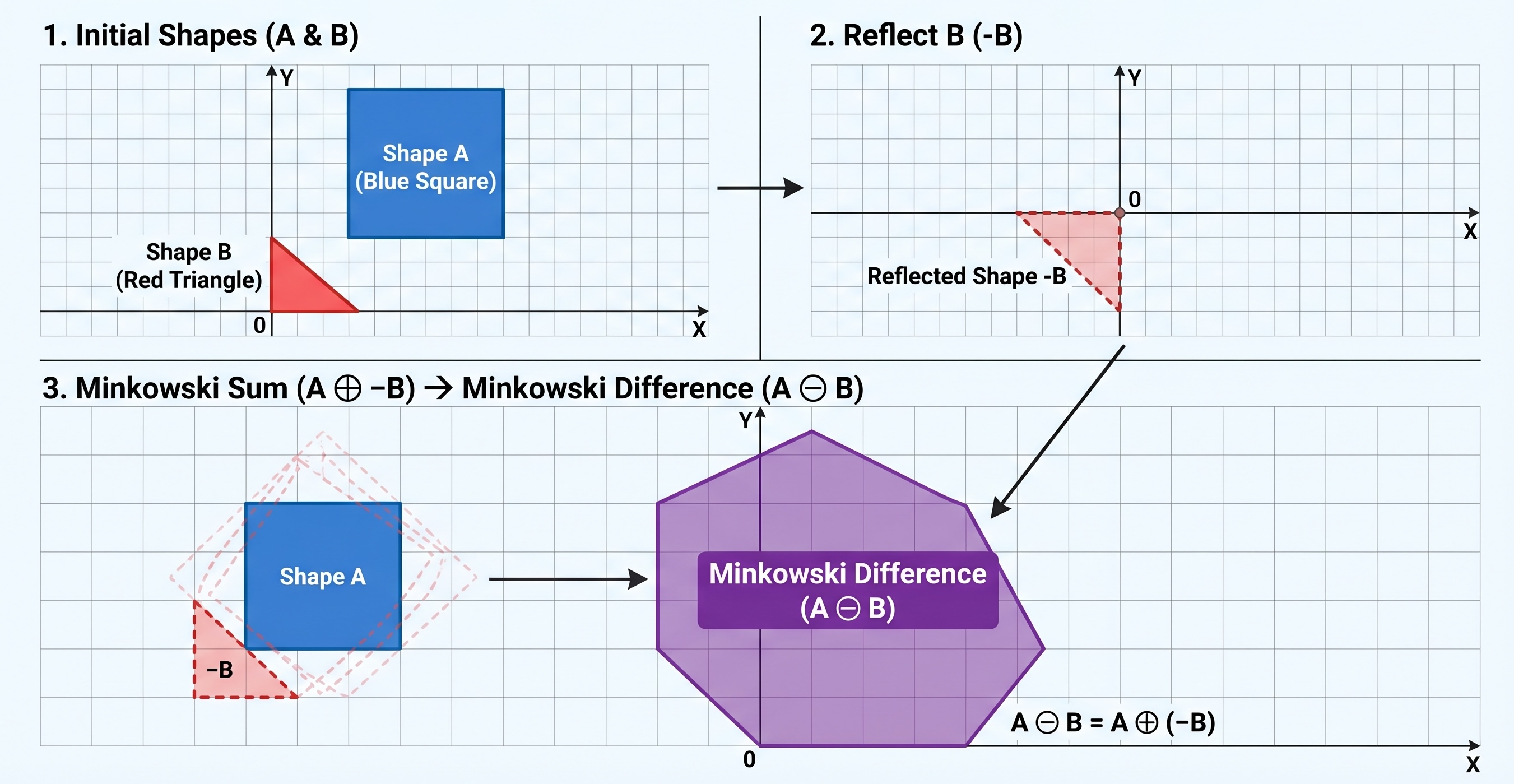 GJK 알고리즘은 민코프스키 차(Minkowski difference)를 이용하여 민코프스키 차에 원점이 포함되는지 여부를 판단한다.