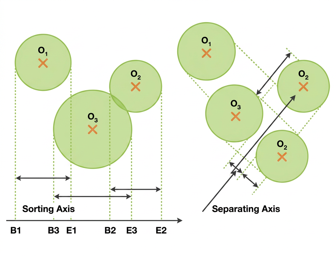우선 모든 물체의 바운딩 박스의 최소값과 최대값을 특정한 축을 기준으로 정렬한다. 이후 정렬된 리스트를 훑으면서(Sweep) 겹치는 구간이 있는지 확인한다. 한 축에서 겹치지 않는다면, 다른 축을 검사할 필요 없이(Prune) 충돌이 발생하지 않는다고 판단할 수 있다.