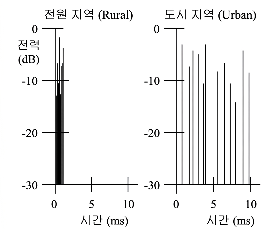 \[S = \frac{\alpha}{r} \cos(2 \pi f_c (t - \frac{r}{c})) - \frac{\alpha}{(2d - r)} \cos(2 \pi f_c (t - \frac{2d - r}{c}))\] \[\begin{aligned} \Delta \theta &= \frac{2 \pi f_c (2d - r)}{c} + \pi - \frac{2 \pi f_c r}{c} \\ &= 2 \pi f_c \underbrace{\left( \frac{2d - r}{c} - \frac{r}{c} \right)}_{\text{Delay Spread}} \\ &= 2 \pi f_c \underbrace{\frac{2d - 2r}{c}}_{\text{Delay Spread}} \\ \end{aligned}\] \[T_d = \frac{2d - 2r}{c}\]전원 지역은 장애물이 적어 비교적 작은 Delay Spread를 보이는 반면, 도심 지역은 장애물이 많아 큰 Delay Spread를 보인다.