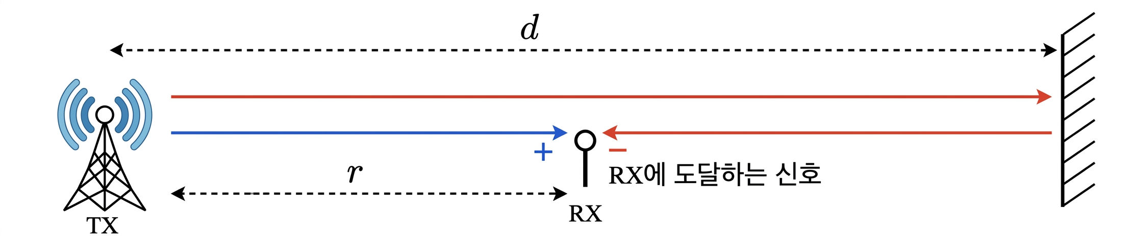 위와 같이, 1차원 상으로 모델링된 길이 $r$ 인 신호, 거리 $d$ 밖의 벽에 부딪혀 돌아오는 신호가 Rx에 도달하는 상황을 가정할 수 있다. 이 때 $r$ 동안 전파된 신호를 LOS 신호로, 길이 $d + (d - r)$ 동안 전파된 신호를 NLOS 신호로 간주할 수 있다. 이 때 Rx에 도달하는 신호는 보강간섭 혹은 상쇄간섭이 발생할 수 있다. NLOS 신호를 다중 경로에 의해 소규모 페이딩되었다고 표현할 수 있다.